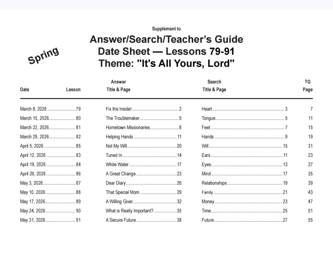 The purpose of this quarter is to focus on the meaning of complete consecration. Keeping this in mind, we started this quarter with a lesson on the heart, “for out of it are the issues of life.” We continued with various members of the physical body, showing that each member can be consecrated and can be used in the service of the Lord. In order to be totally committed to Christ, we should not only consecrate the parts of our physical body, but also our will, time, money, relationships, and future. As you study these lessons, you will find that in many cases they overlap. For instance, the lesson which deals with the tongue relates closely to the lesson on the heart, “for out of the abundance of the heart the mouth speaketh.” We are not suggesting that each part can be consecrated as a segment, or in a certain progression, but rather endeavoring to stress that total commitment to Christ involves all of these aspects. Consecration begins with salvation when one dedicates his life to God, but total commitment to Him involves day-to-day decisions. You might say that we have taken one lesson on total consecration and divided it into thirteen sections in order to give an in-depth coverage.